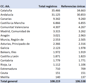 A nivel nacional, excluidas las CCAA forales (Navarra y Euskadi), el total de registros correspondientes a construcciones marcadas como destino oficinas es de 108.219 registros (106.538 referencias únicas):